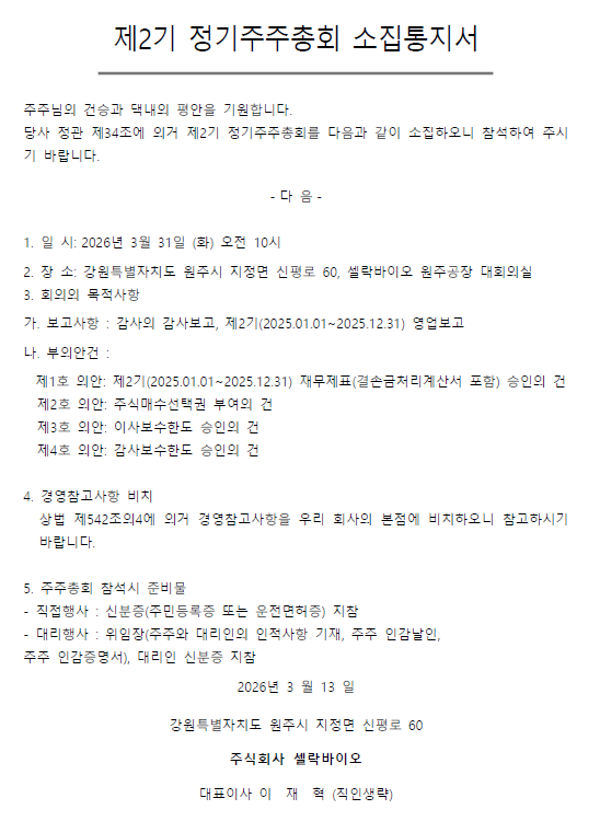 주식회사 셀락바이오는 2025년 8월 22일 개최한 당사 이사회에서 아래와 같이 제3자 배정 방식의 유상증자를 통한 신주 발행을 결의하였기에 이를 공고합니다.